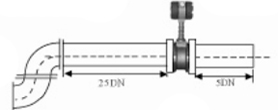 5.不同平面兩個彎管的安裝 如果流量計的前端有兩個90°彎頭,要保證流量計的前直管段≥25D,后直管段≥5D | | |||||||||||