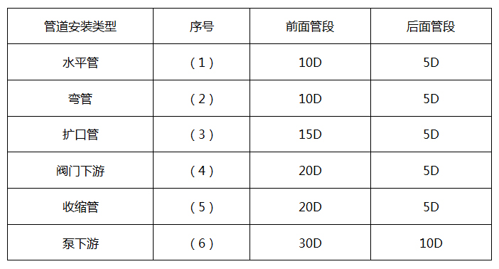 安裝儀表時應(yīng)遠(yuǎn)離彎頭,障礙物,變徑,閥門,以保證有一個穩(wěn)定的流場,一般要求有一個較長的上下直管道,前直管段長大于10D,后直管段長大于5D。