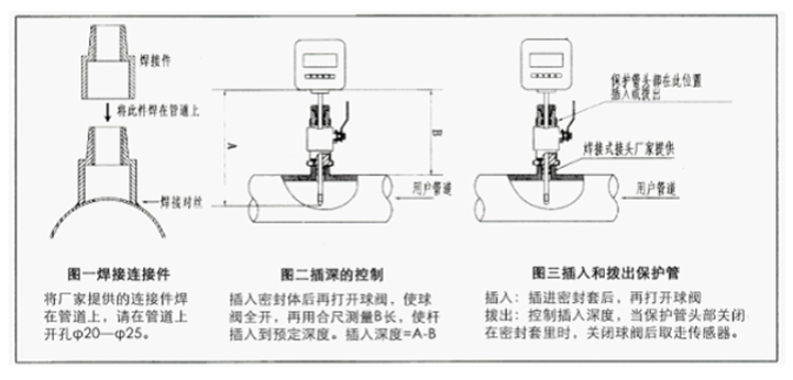 在管道中如有氣體,總是希望不因為傳感器的插入和撥出將氣體引出,為此廠家提供帶球閥的密封裝置,利用密封裝置,防止氣體跑出,請見下圖。